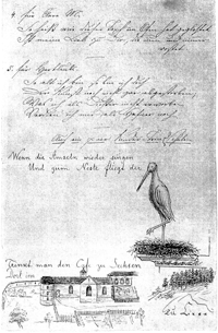 Und zum Neste fl iegt der ... (Bild: Storch), Trinkt man den Cafe zu SechsenDort im ... (Bild: Kloster) ... (Bild: Wald) zu Lxxx“ |